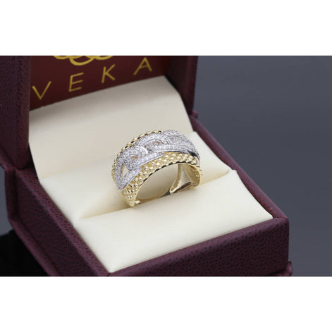 10 Karat Gold Woman Ring with two-tone gold circles and zircon stones around it. The Ring Weighs Approximately 4.8 Grams With An Average Length Of 17.5 Mm And Average Width Of 21.4 mm -100% REAL...