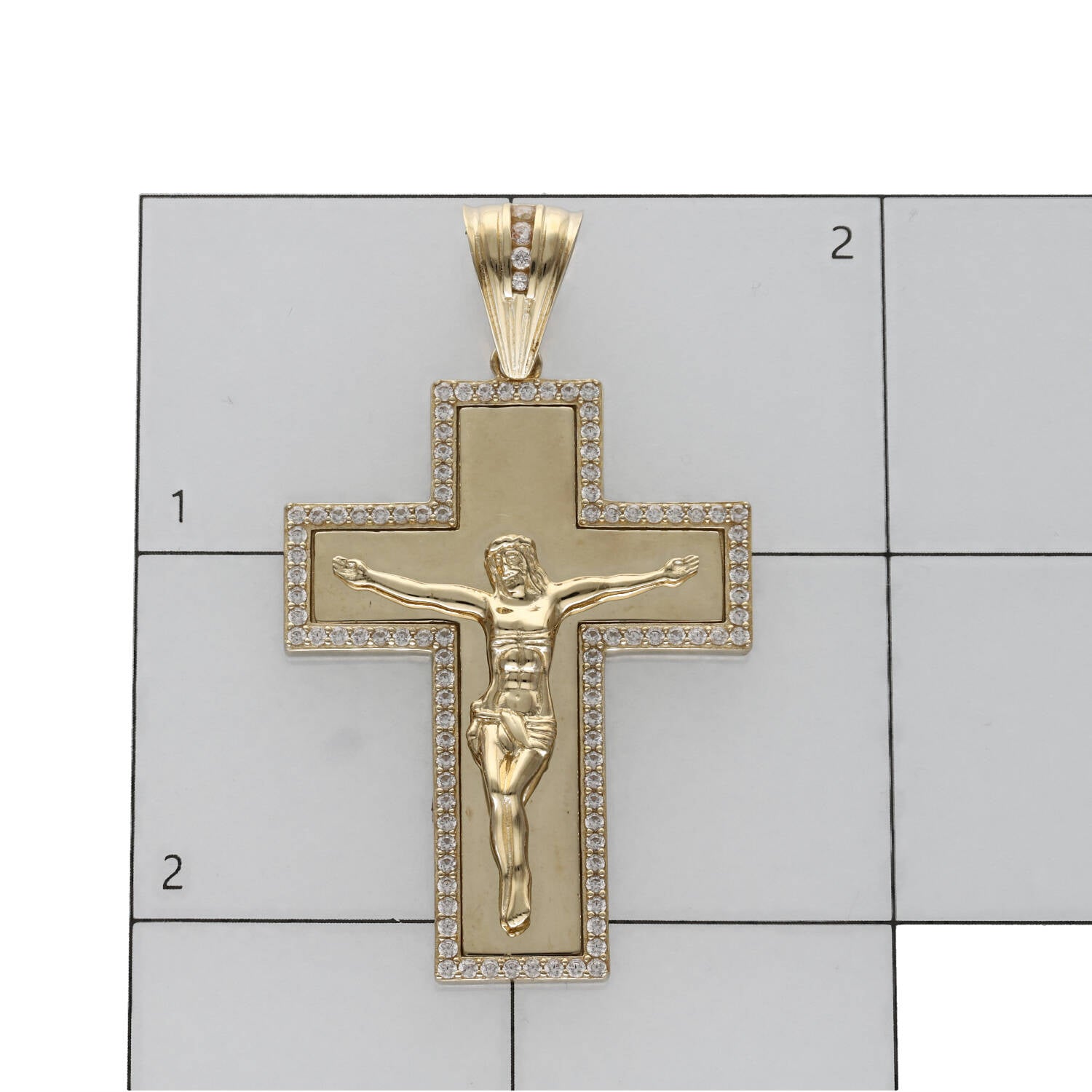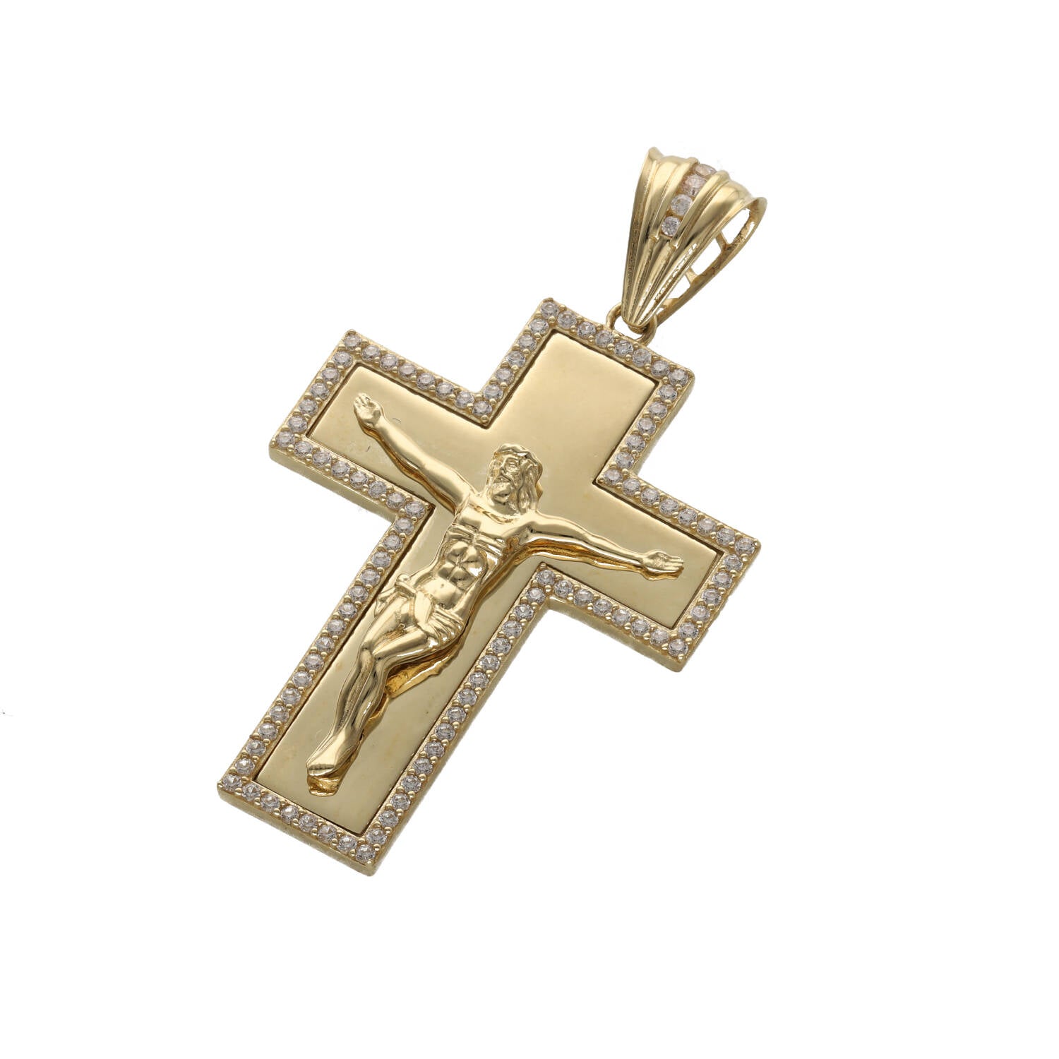 This CZ border crucifix pendant showcases exceptional attention to detail with small round cubic zirconia stones elegantly framing the cross. The high-polished yellow gold background creates stunning contrast, making the detailed Jesus figure the focal point while the sparkling CZ border adds luxurious brilliance.
