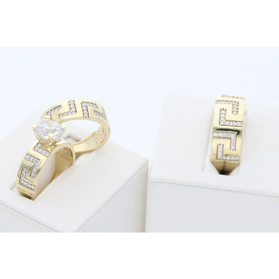 10K Gold Trio Wedding Ring Set - Maze Design with Zirconium Stones