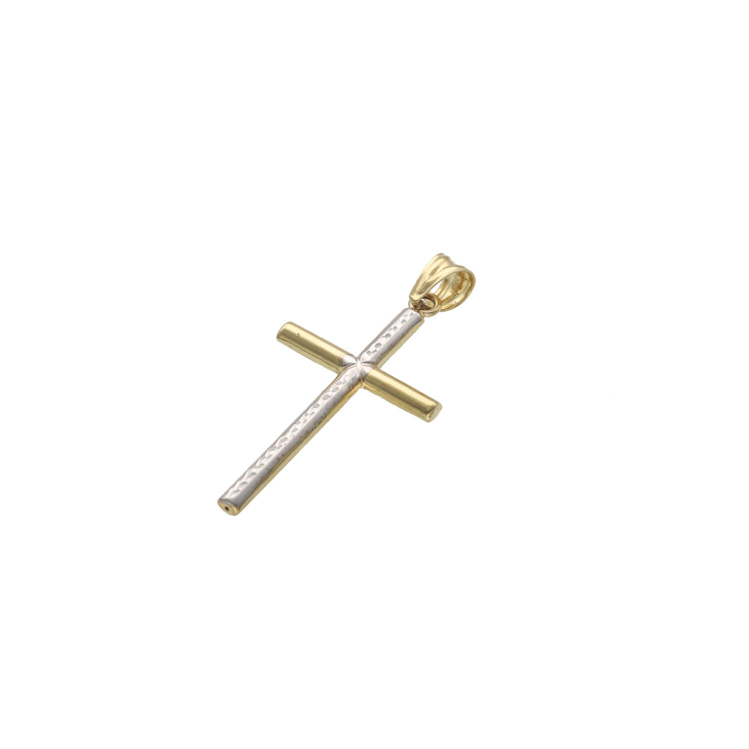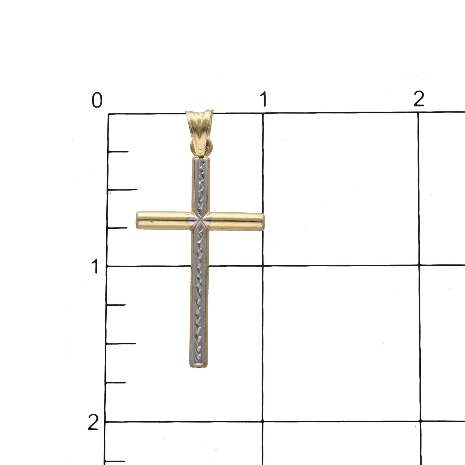 Discover the perfect blend of elegance and affordability with this stunning 10K two-tone gold cross charm. Featuring a beautiful diamond-cut white gold vertical line contrasted against smooth yellow gold, this piece offers eye-catching dimension and sparkle.