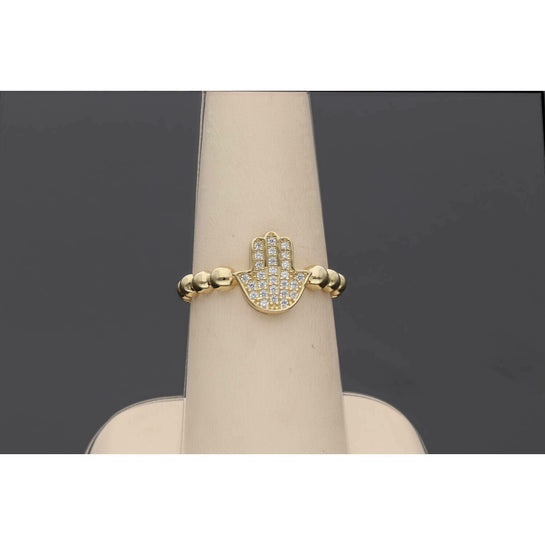 14 Karat Yellow Gold Woman Ring Hamsa hand with encrusted zircons. The Ring Weighs Approximately 3.5 Grams With An Average Length Of 10.3 Mm And Average Width Of 9.7 mm