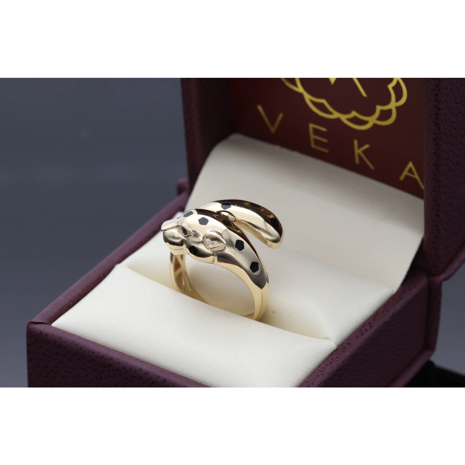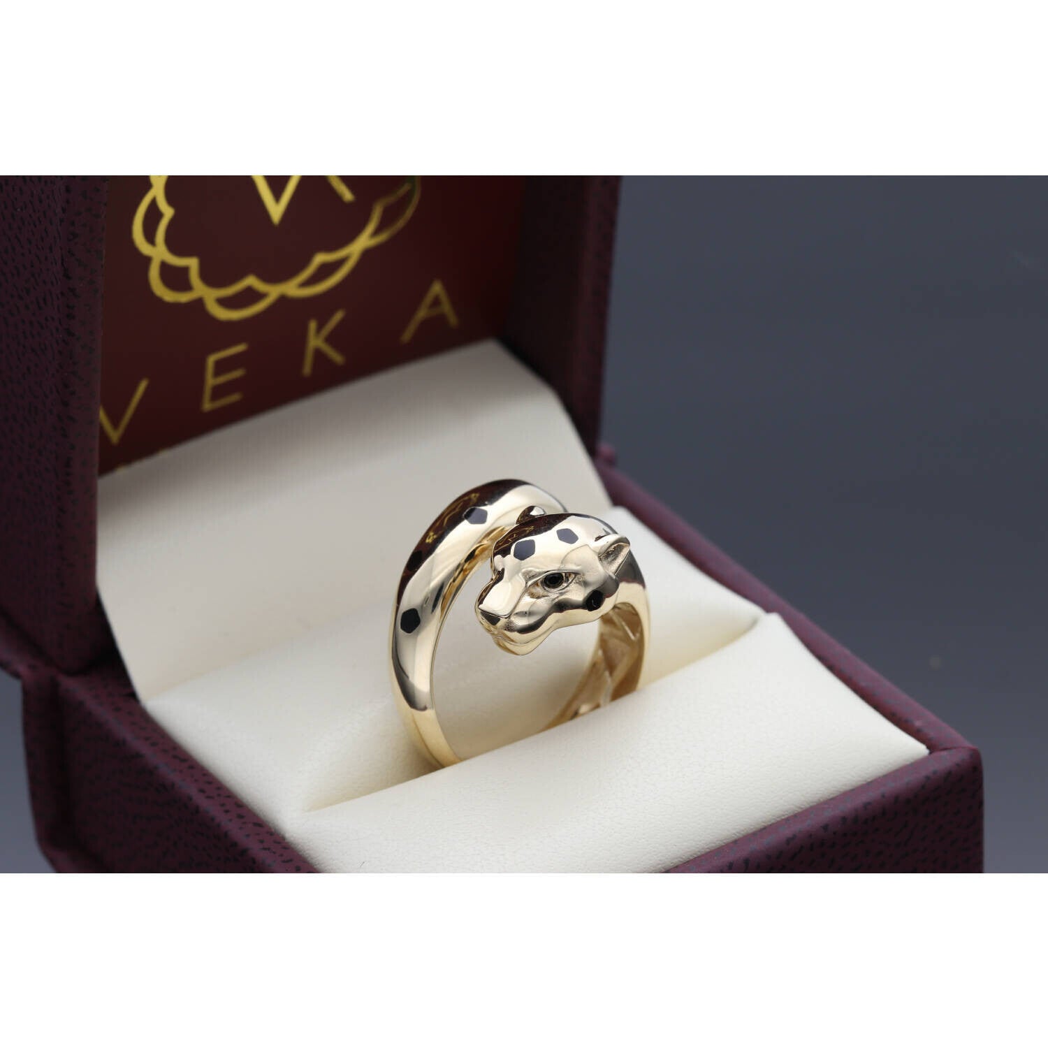 14 Karat Gold Ring with the shape of a Jaguar, Carved Fur and Black zirconium stones in the eyes.
